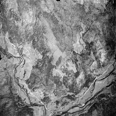 This series of aerial photographs was commissioned by the Brown Company from Fairchild Aerial Surveys, Inc. The images were captured in a North-South direction at an altitude of 12,415 ft. with a focal length of 8.25 inches, an overlap of 60% and a sidelap of 20%. The scale is 1:18,000. University of California, Santa Barbara scanned 9 inches x 9 inches photographic prints at 600 ppi using a Umax PowerLook 2100XL flatbed scanner.