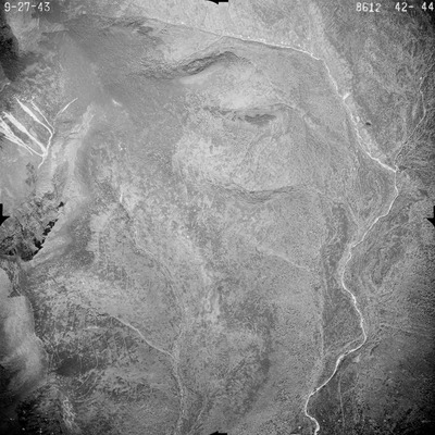 This series of aerial photographs was commissioned by the Brown Company from Fairchild Aerial Surveys, Inc. The images were captured in a North-South direction at an altitude of 12,415 ft. with a focal length of 8.25 inches, an overlap of 60% and a sidelap of 20%. The scale is 1:18,000. University of California, Santa Barbara scanned 9 inches x 9 inches photographic prints at 600 ppi using a Umax PowerLook 2100XL flatbed scanner.