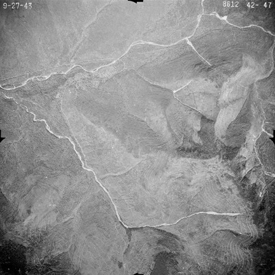 This series of aerial photographs was commissioned by the Brown Company from Fairchild Aerial Surveys, Inc. The images were captured in a North-South direction at an altitude of 12,415 ft. with a focal length of 8.25 inches, an overlap of 60% and a sidelap of 20%. The scale is 1:18,000. University of California, Santa Barbara scanned 9 inches x 9 inches photographic prints at 600 ppi using a Umax PowerLook 2100XL flatbed scanner.