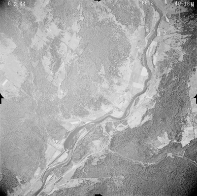 This series of aerial photographs was commissioned by the Brown Company from Fairchild Aerial Surveys, Inc. The images were captured in a North-South direction at an altitude of 12,415 ft. with a focal length of 8.25 inches, an overlap of 60% and a sidelap of 20%. The scale is 1:18,000. University of California, Santa Barbara scanned 9 inches x 9 inches photographic prints at 600 ppi using a Umax PowerLook 2100XL flatbed scanner.