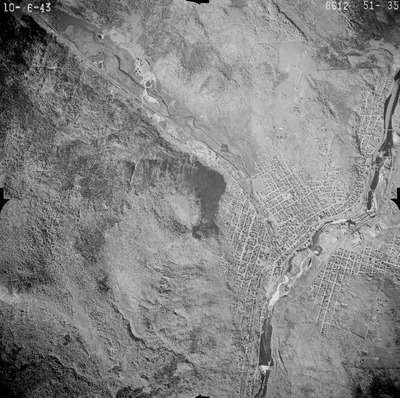 This series of aerial photographs was commissioned by the Brown Company from Fairchild Aerial Surveys, Inc. The images were captured in a North-South direction at an altitude of 12,415 ft. with a focal length of 8.25 inches, an overlap of 60% and a sidelap of 20%. The scale is 1:18,000. University of California, Santa Barbara scanned 9 inches x 9 inches photographic prints at 600 ppi using a Umax PowerLook 2100XL flatbed scanner.