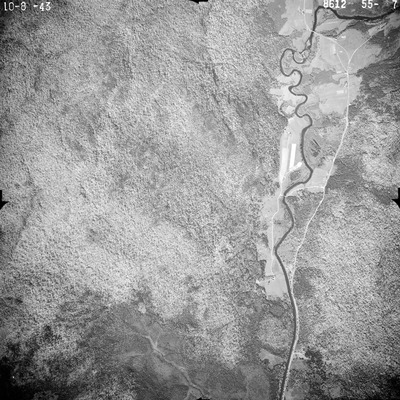 This series of aerial photographs was commissioned by the Brown Company from Fairchild Aerial Surveys, Inc. The images were captured in a North-South direction at an altitude of 12,415 ft. with a focal length of 8.25 inches, an overlap of 60% and a sidelap of 20%. The scale is 1:18,000. University of California, Santa Barbara scanned 9 inches x 9 inches photographic prints at 600 ppi using a Umax PowerLook 2100XL flatbed scanner.