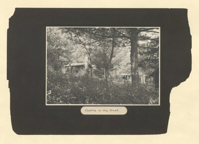 Page 5 of a photographic album containing 37 photographic prints of Pinewoods Camp and it's surrounding environment on Long Pond, Plymouth Massachusetts from 1939-41; created by Robert H. Buckie and the Country Dance Society, Inc. The photograph is titled "Cabins in the Pines."