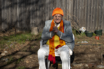 An elder Bhutanese man sits in the backyard during the house-warming ceremony.