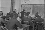Photograph of a German lesson at a school for adults in Stalinabad (Dushanbe), taken by Lotte Jacobi in Tajikistan, Central Asia, ca. 1932-1933. Men and women are sitting at wooden desks facing a chalkboard in a classroom. Some people are wearing embroidered hats. The instructor is facing the chalkboard, writing, wearing a long coat and her hair pulled back into a barrette.