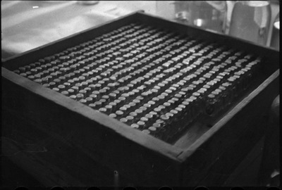 Photograph of perfume bottles at a factory in Central Asia, taken by Lotte Jacobi, December 13, 1932. Shot of a large shallow box packed with rows of glass perfume bottles.