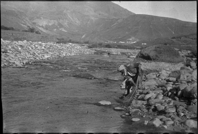 Photograph of a fisherman at a river in Central Asia, possibly Tajikistan, taken by Lotte Jacobi in the November of 1932. A man wearing a turban is standing on the rocky banks of a river, pulling a net from the water. Mountains are visible in the distance behind him.