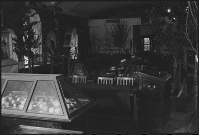 Photograph of a room in a horticultural museum, taken by Lotte Jacobi in the USSR, ca. 1932-1933. Pieces of fruit are displayed in a glass cases in a room and plants are displayed along the walls.