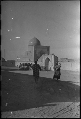 Photograph of a street scene near the Tower of Death (Kalyan minaret) taken by Lotte Jacobi in Bukhara, Uzbekistan, Central Asia, ca. 1932-1933. A domed building is visible past a dirt courtyard in a sparse landscape. A group of camels and donkeys are in the back of the courtyard, a man is walking into the courtyard, and a woman holding a baby is walking away from the courtyard toward the camera.