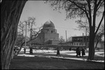 Photograph of the tomb of the conqueror Tamerlane (Timur, Amir Timur), taken by Lotte Jacobi in Samarkand, Uzbekistan, Central Asia, December 7, 1932. A domed building is visible across a snowy street where people are walking. Less ornate buildings are built near the domed structure, some with clothes lines hung on the porches.