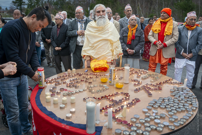 Hindu priests and the community gathered in a parking lot to pray for the victims of a recent and devastating earthquake in Nepal. The candles spell out "Pray for Nepal."