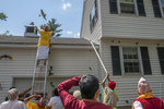 A Hindu priest tossed greens attached to a rope over the garage. Greens tied along a rope were hung up all around the house as a blessing for the new home.