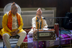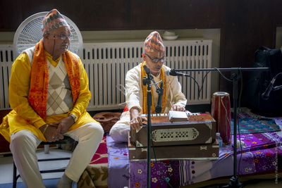 A Hindu priests played the harmonium as another one looked on during the purana celebration.