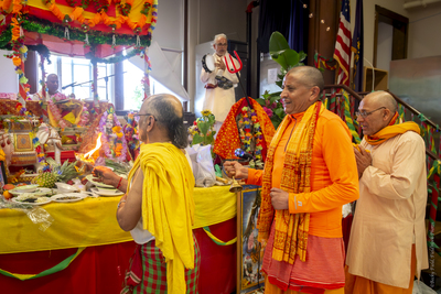 Hindu priests at a shrine during the ceremony.