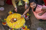 As part of the ceremony for the new home, tufts of string soaked in oil are arranged in a circle and lit.